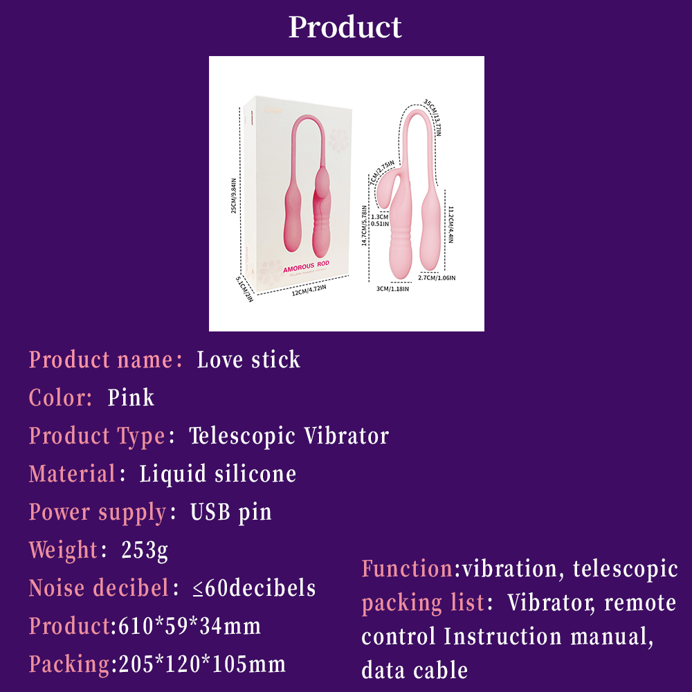 This innovative vibrator features a double-headed structure with telescopic motion for versatile stimulation. The shaped top and elongated length provide deep and precise pleasure for multiple erogenous zones.