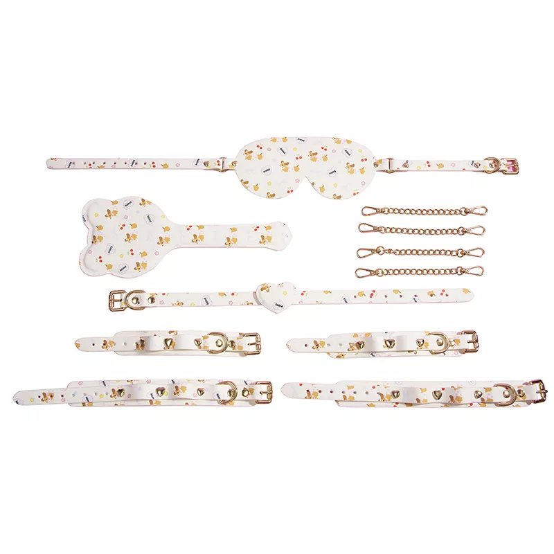 - Complete set with collar, wrist and ankle bands, and eye mask